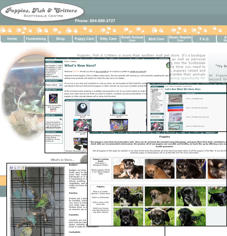 Puppies, Fish & Critters is a boutique pet store specializing in fresh-water fish and puppies. It is located in Scottsdale Mall, Delta , British Columbia , Canada .