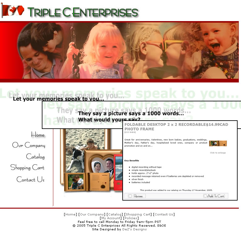 Triple C Enterprises, based in Surrey, British Columbia, Canada, is a retailer/wholesaler of a variety of different recordable photo frames.