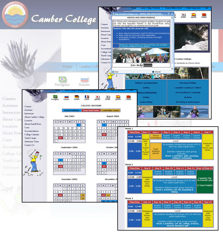 Cambercollege.com is a large site consisting of 44 unique pages. The site was fully redesigned in August 2005. It was a challenge as the time frame was limited and included pages in 9 languages - English, Portuguese, Russian, German, Japanese, Korean, Spanish, Chinese and French. It also contained a lengthy online registration page and Macromedia Flash animation.